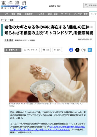 東洋経済オンライン『老化のカギとなる体の中に存在する「組織」の正体…知られざる細胞の主役「ミトコンドリア」を徹底解説』